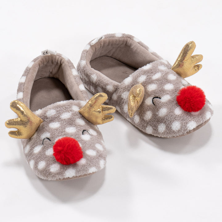 Unsere flauschigen Rentier-Hausschuhe mit 3D-Goldglitzer Geweih und Stubsnase sind lustig wie auch supersüß.